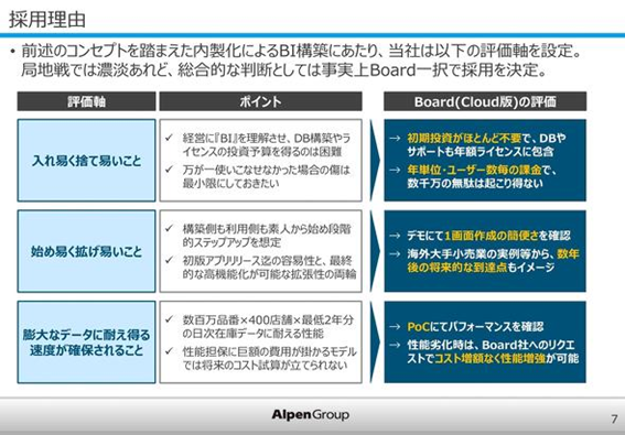 アルペングループの場合、「古い基幹系システムとスプレッドシートの集合体で経営を回してきた」という状態からの改革だった。始めやすく広げやすいことを重視したのは、早く体験しなければ次のアクションができないとの判断からだ。BIでできることを関係者が肌感覚でつかむタイミングを早くすることを重視した。