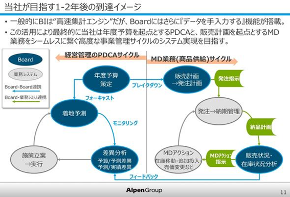 導入着手から1年ほどで全社展開のめどがついたアルペンは、今後Boardを介して経営計画と事業運営の分析や最適化を高速で回す体制を目指す考えだという。