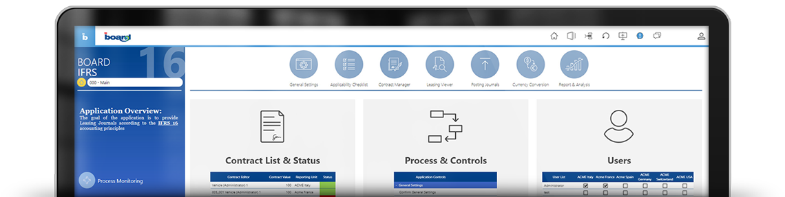 Board Lease Accounting consente alle organizzazioni di generare e pubblicare con facilità le scritture contabili realtive ai contratti di leasing in conformità sia alla normativa IFRS 16, sia allo standard ASC 842. L’applicazione fornisce una checklist integrata che permette agli utenti di conoscere rapidamente la conformità del contratto in accordo a ciascuno degli standard.