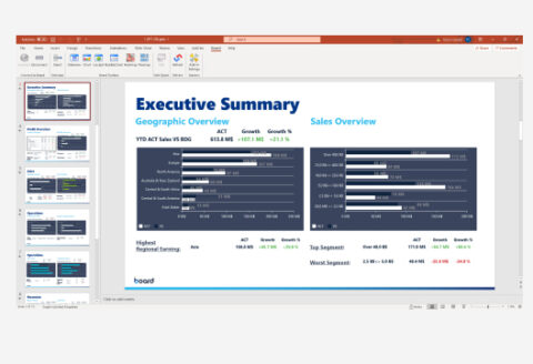 主要指標を継続的にモニタリングできます。BoardのWord・Excel・PowerPointアドインを活用すれば、グラフ・表・テキストが自動的に
