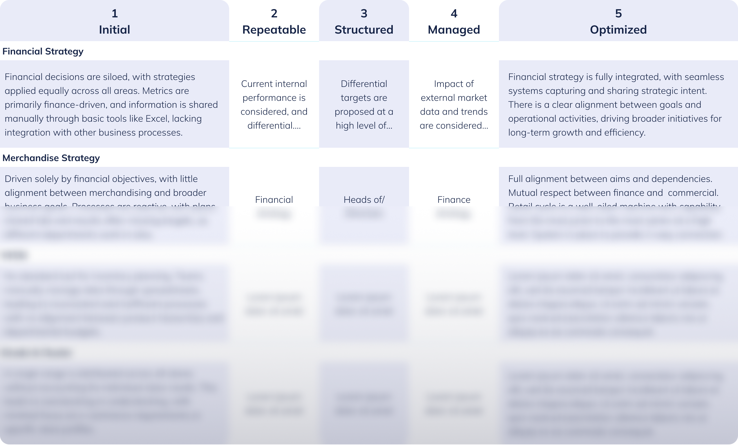 Die „Maturity Matrix“ beschreibt fünf Entwicklungsstufen, von „Initial“ bis „Optimized“. Jedes Level bietet klare Aktionspunkte, die Ihnen helfen, Ihre Prozesse zu verbessern und sich dem Ziel einer vollständig integrierten, datengesteuerten und skalierbaren Planung anzunähern.